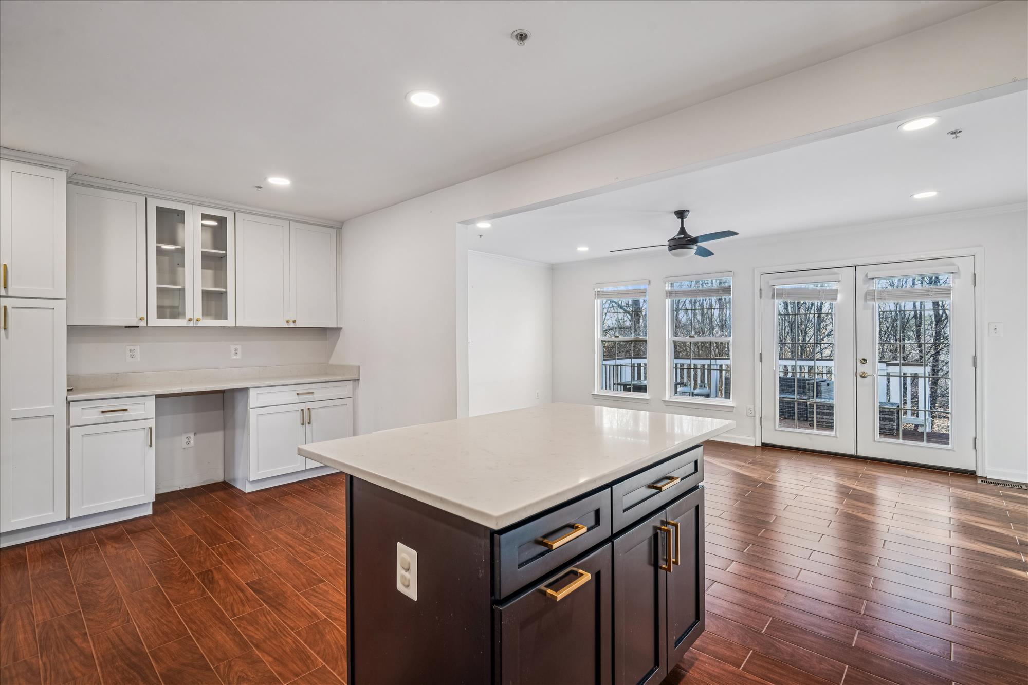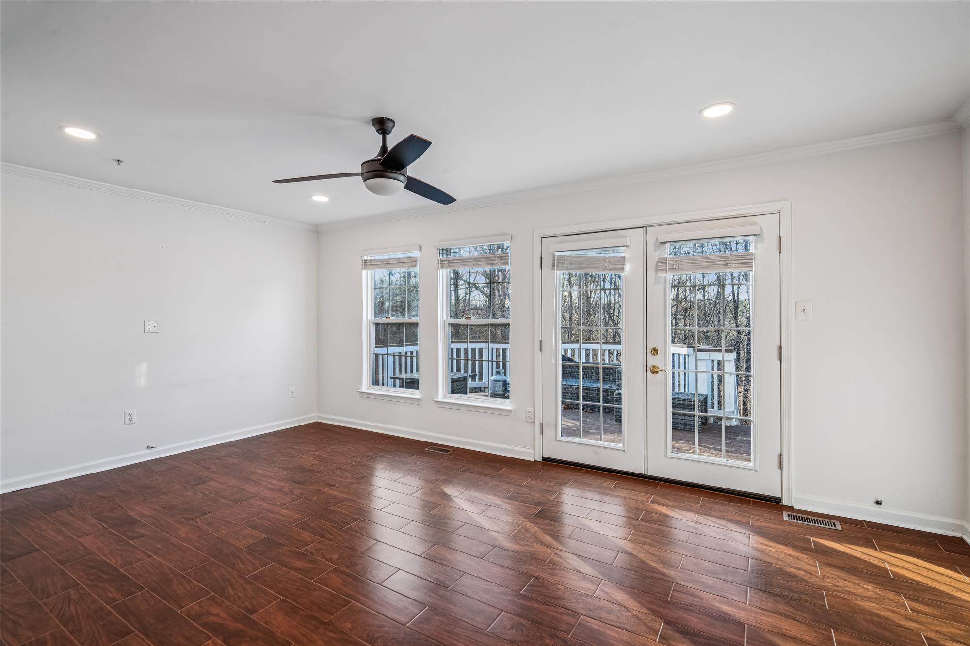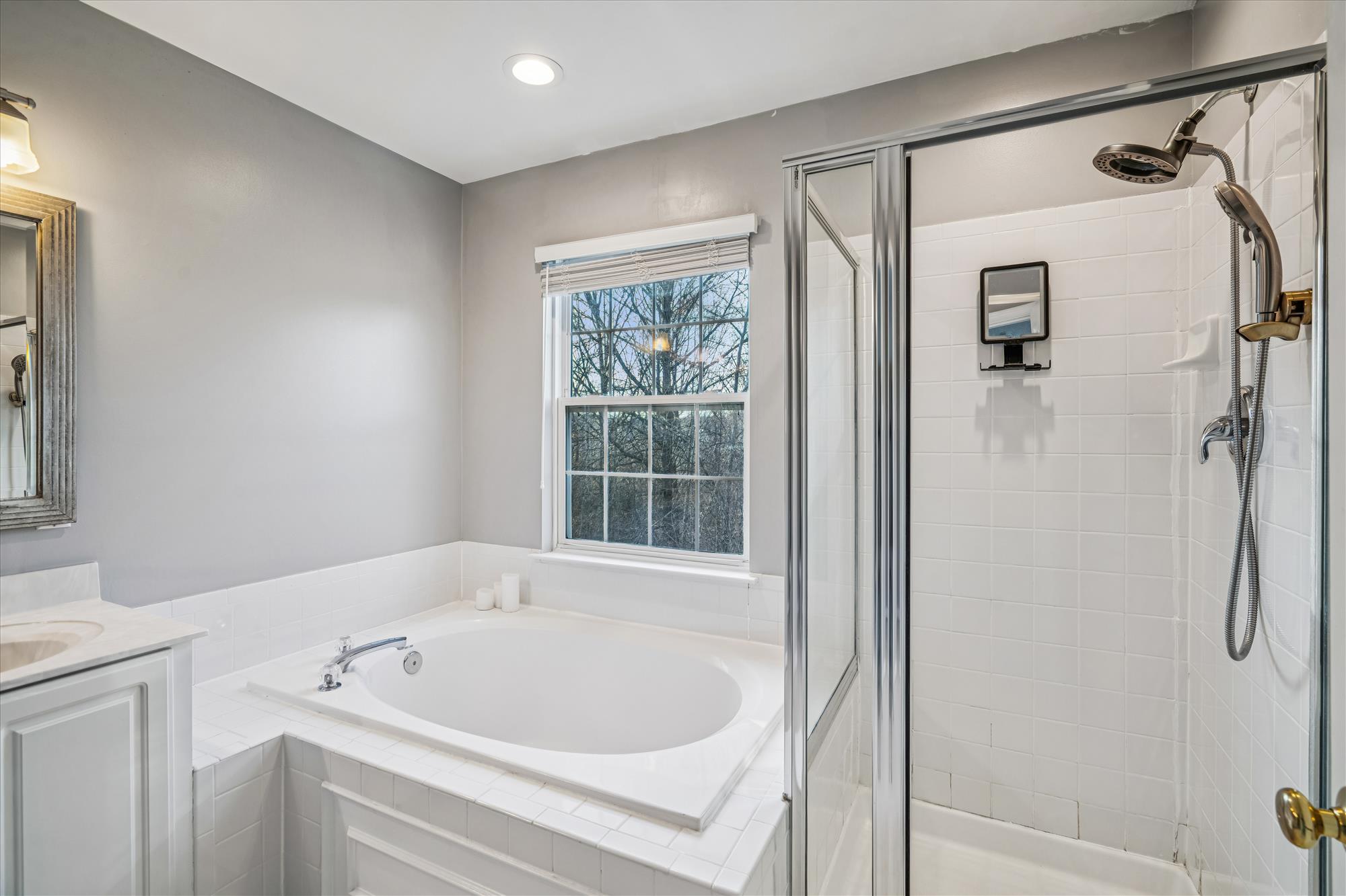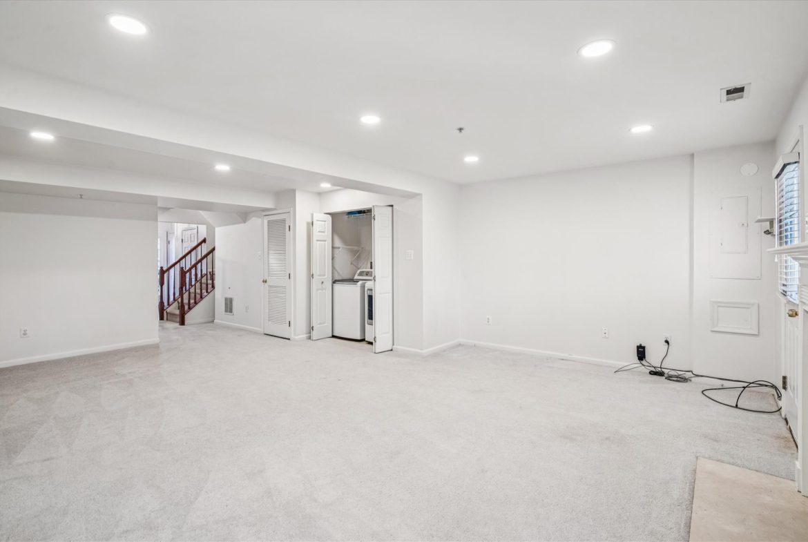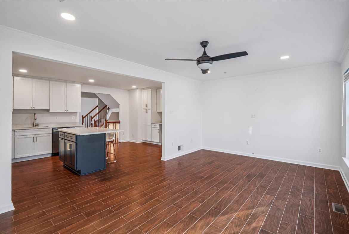 The top floor features the spacious owner’s bedroom with a sitting area, a spacious walk-in closet with built-ins, and a spa-like bathroom with a shower and a soaking tub. There are two additional bedrooms with hardwood flooring and a full hall bath.